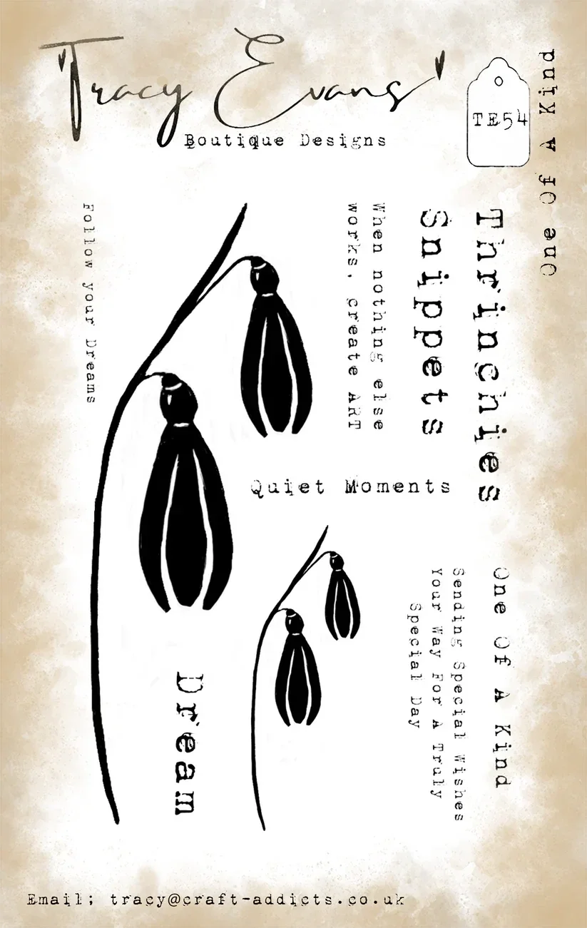 10 individual stamps on an A7 stamp set which offers amazing value . This beautiful individual Snowdrop works beautifully with stamp set TE31. I have also included the words “Thrinchies” and “Snippets” wording because those that follow me know that I run a series of Thrinchies and Snippets projects in my group and on YouTube.