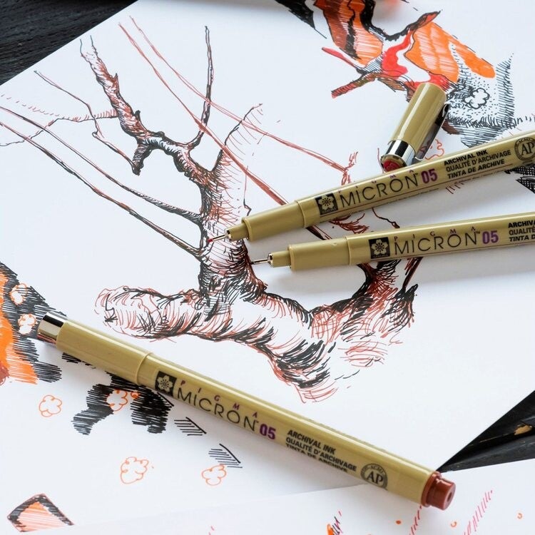 vier Pigma Micron 05 (0,45 mm) Fineliner in den Farben Orange, Rot, Braun und Schwarz.